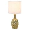Simple and understated pieces sometimes have the biggest impact in design. Our diamond cut Pineapple Table Lamp is no exception, with its clean form and whimsical detailing. A gold leaf, diamond cut pineapple inspired base is complimented by a white and gold palm printed shade for a modern touch. Requires one (1) 60 watt bulb, not included. Constructed of ceramic. Measures: 9x9x19″