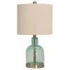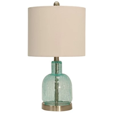 Silver metallic accents enhance the look of this table lamp’s light teal glass frame. The base, central support, neck, and finial are all metal with a gleaming finish. A white fabric shade completes the look, making this glass table lamp a beautiful addition to a living room, dining room, hallway, office, or bedroom. With its ocean-inspired style and versatile color scheme, this table lamp is the perfect upgrade for coastal dĂ©cor in a hallway, living room, bedroom, office, or dining room. Highlight your home dĂ©cor with this Glass Table Lamp Seafoam Blue from the Signature Collection by StyleCraft Home Collection. This glass table lamp brings a touch of sea-inspired natural beauty to any master suite. The translucent crackled seafoam blue glass brings a fun, exciting quality to the fixture. The hardback drum shade is constructed from beige fabric and complements the metal base and matching silver finial topper. This piece exemplifies superior product design and great styling at an unbeatable price. This will pair well with coastal styling and is sure to be a conversation piece. Regardless if you put it in the bedroom or family room, this lamp stands out. Suitable for residential use in a dry location. This table lamp is UL listed in compliance with the nationally recognized safety standards.