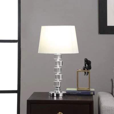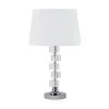 Celebrate modern artistic expressionism with this Adelaine crystal accent table lamp featuring eye-catching crystal round cube accents. Expertly arranged zig zag-inspired imported crystal orbs accents allow this contemporary table lamp to provide stunning accent lighting. Illuminate any room in your home with this luxurious crystal table lamp. With high chrome shine accents, this contemporary style is topped with a crisp white semi-bell shade. Visually intriguing, this crystal accent table lamp is full of radiance. Cast a warm glow with the reflective polished chrome finish and crystal round cube accents in a ladder, zig zag-inspired pattern on the body of the sleek silhouette. Clean up a room with the smooth lines from the metal silhouette and the bright, white linen fabric shade that will create a soft and pleasing glow. Each Imported Crystal Round Cubes measures 2.5″L x 1.5″H. White Semi-Drum Cotton/Linen Uno-Fitter Shade measures 12″L x 10″W x 8″H. Table Lamp Base to the In-Line On/Off Switch is 11.25″L. Metal/Crystal Cube Orbs Table Base measures 5″L x 15.5″H.