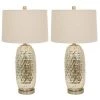 Take your living space design to the next level by adding this alluring Dimple Glass Table Lamp Set. This set of two table lamps feature a class shaped base in a lovely antique mercury glass finish, adding a glamourous appeal to your night stand, end table or console table. The dimple effect of the glass base adds a subtle touch of texture to your space. The vintage feel for these table lamps pairs well with the neutral, white linen drum shade, which lends a modern feel. Sold as a set of two. Each lamp requires one (1) 150 watt bulb, not included and measures 15x15x27.5
