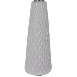A sophisticated combination of beauty and function, the Harper Ceramic Table Lamp instantly adds charming style to your night stand or side table while brightening the space. A simple double gourd ceramic base is both traditional and romantic. A round linen shade lends a modern, fresh feeling. Available in a variety of finishes, allowing you to find the color that best suites your design palette, whether it is neutral or a pop of color. The 3-way light feature allows you to give the perfect amount of lighting for every occasion, whether it is reading or entertaining. Requires one (1) 150 watt bulb, not included. Constructed of ceramic. Measures 14x14x27″.