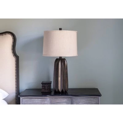 Enjoy the versatility of the Brown Resin Table Lamp as its sculpted design and shape makes decorating a joy! The ribbed resin lamp base is finished in a beautiful, neutral earth tone that will thrive among ancient custom accessories. It will also make your modern decor seem a bit eclectic when placed among a few glass furnishings. The hardback drum shade add dimension with its constrasting color. Make this piece a part of your decor today! Constructed of resin and measures: 29.5 x 18 x 18″.