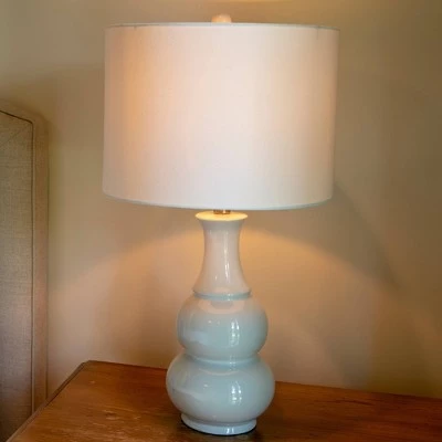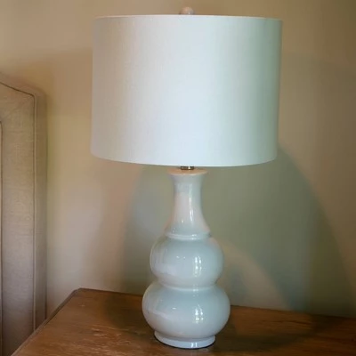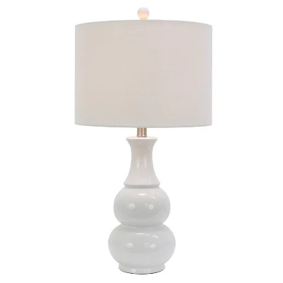 A sophisticated combination of beauty and function, the Harper Ceramic Table Lamp instantly adds charming style to your night stand or side table while brightening the space. A simple double gourd ceramic base is both traditional and romantic. A round drum shade lends a modern, fresh feeling. Available in a variety of finishes, allowing you to find the color that best suites your design palette, whether it is neutral or a pop of color. Constructed of ceramic. Measures 14x14x26.5″