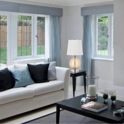 Cal Lighting makes this Contemporary glass table lamp with metal base and matching taper drum fabric shade. This Amber colored glass Planet design table lamp has a base in Brushed Steel finish. This lamp uses one 150 watt 3-way bulb (bulb is not included.) Imagine how this table lamp will look great in your dining room, living room, bedroom, kitchen, family room, or office.