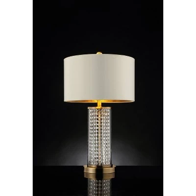 Elegant yet understated, this Crystal Pluviam table lamp is sure to please. The perfect addition to modern decor, this crystal table lamp features a cylindrical glass drum w/ stacked imported crystal beading strands cascading like waterfall to a crisp off white linen shade w/ matte gold lining for a dramatic effect and creates a stunning and clean appeal. Sleek and stylish, this crystal column table lamp is a living room or bedroom essential. Matte gold finish steel accents elegantly play up its chic, crystals and glass body, giving it a truly sophisticated look. Ideal for an end table, its off-white drum shade w/ matte gold lining creates the perfect amount of light for leisurely evenings at home. Add some glam to your decor with this wonderful accent light. Update any space instantly by adding this glam crystal glass table lamp.