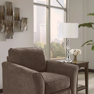 Sensual curves emphasize the romantic feel of crystal glass, offering an artistic and elegant ambiance. With a chrome metal profile and crystal glass design, this contemporary Leona table lamp has a stunning and lavish quality. It has an integrated built-in outlet that allows you to charge a phone or small electronic device. Update any space instantly by adding this glam crystal glass table lamp. The sensual curves profile adds lovely detail, also serving as the base for a sphere detail. The base of this distinctive modern table lamp is made from a triple crystal orb, with grooves and ridges at the top and bottom, and a sleek round base for support. A K/D white linen drum shade tops off the design beautifully and creates a pleasing, soft glow.