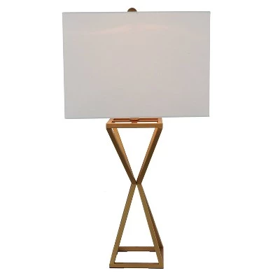Sharp lines borrow from mid-century modern style in this open-frame table lamp. Finished in a metallic gold-painted shine, the lamp’s base is constructed of two inverted stacked pyramids, open framed and joined at the center for an hourglass-inspired silhouette. The trend of sharp, straight lines continues in the drum shade, which forgoes the traditional round shape in favor of a rectangle.