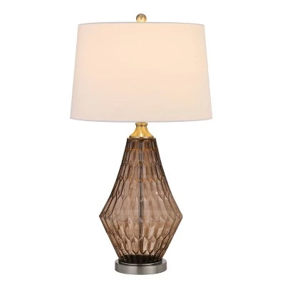 Cal Lighting makes this Contemporary glass table lamp in Smoky finish with Brushed Steel finish metal base with hardback taper drum shade. This lamp uses one 150 watt 3-way bulb (not included). Illuminate your space with this concave patterned smoked glass table lamp. It features a wide bottom and will look great in your Livingroom, bedroom, or office.
