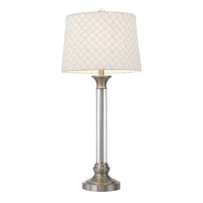 Cal Lighting makes this Contemporary crystal body table lamp with metal base and matching drum fabric shade. This clear layered design table lamp has a base in Brushed Steel finish. This lamp uses one 150 watt 3-way bulb (bulb is not included.) Imagine how this table lamp will look great in your dining room, living room, bedroom, kitchen, family room, or office.