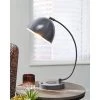 A beautiful accent to your desk, this lamp with its adjustable dome shade casts cool shadows as it suspends from a dramatic stem. Featuring a wireless charging pad and 1 USB charging port, you can charge up without cords or clutter. Turn on your decor with this on-trend accent lamp in any space, and give a nod to contemporary style with the flip of a switch. Gray finished metal desk lamp. Metal shade. Adjustable neck. (1) Wireless charger and (1) USB charging port. On/off switch. (1) E26 socket, type G bulb recommended – 40 watts max or 8 watts max CFL. Signature Design by Ashley is a registered trademark of Ashley Furniture Industries, Inc.