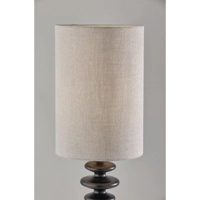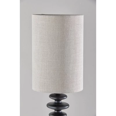 - A matte black finish is paired with a soft, taupe textured fabric shade.