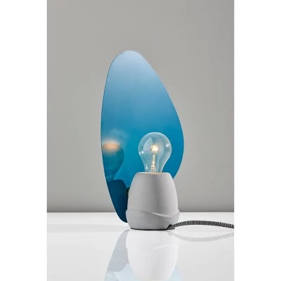 Add a surprising and unique accent to your console table, bookshelf or bedside with the Bonnie Table Lantern. An irregular shaped turquoise metal shade is set atop a natural concrete base. This lamp sits in front of the wall to reflect the light for a soft, ambient glow. Turn the lamp on and off with an industrial brass metal switch. A black and white fabric cord adds modern flare to the design. Bulb is not included.