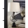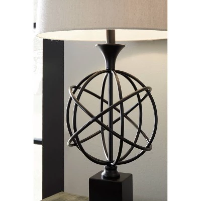 This table lamp is proof you’re made of pure style and sophistication. Classy curves of dark metal intertwine together for plenty of classic charm. Its one-of-a-kind aesthetic is sure to make a stylish impression in any home. Black finished metal table lamp. Modified drum hardback shade. 3-way switch. (1) E26 socket, type A bulb recommended – 150 watts max or 25 watts max CFL. Signature Design by Ashley is a registered trademark of Ashley Furniture Industries, Inc.