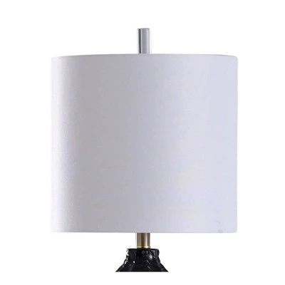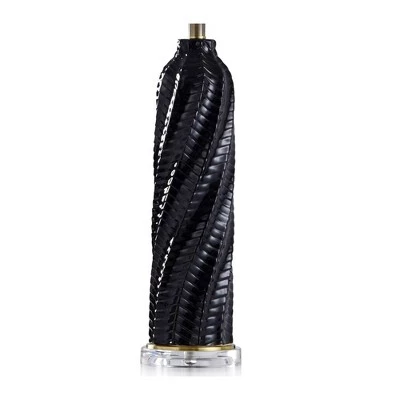 Featuring a clear acrylic base, a glossy black ceramic frame, and a white shade, the Arezzo table lamp enhances contemporary décor in any living room or family room. A textured finish of diagonal swirls on the cylindrical frame showcases varying shades of black. The steel neck of the lamp adds a silver accent, and the clear acrylic finial matches the base. This piece exemplifies superior product design and great styling. It will pair well with contemporary styling. Suitable for residential use in a dry location.