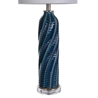 - This lamp body is composed out of ceramic glass that is finished in a turquoise blue-green finish.
