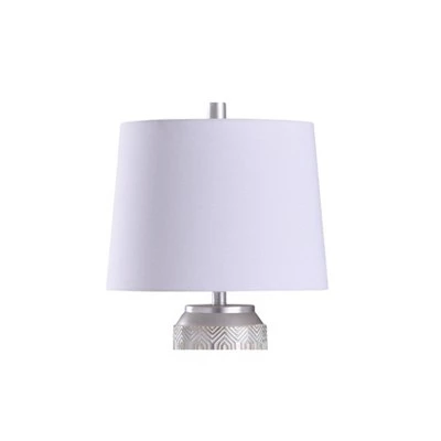 Accent your home décor with this Dawley Diamond Etched table lamp from the Signature Collection by StyleCraft Home Collection. An elaborate design on a simple frame makes this modern table lamp particularly striking. The polyresin body presents a silver etched base, creating a fascinating visual with impressive depth. The linen and polyester shade sports a classy white finish, a nice complement to the silver hue below. An excellent combination of grace and modernism, this lamp serves beautifully in bedrooms, foyers and living rooms. This piece exemplifies superior product design and great styling. It will pair well with contemporary styling. Regardless if you put it in the bedroom or family room, this table lamp stands out. Suitable for residential use in a dry location. This modern table lamp is UL listed in compliance with the nationally recognized safety standards.