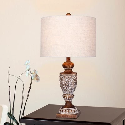 Create an appealing look in your home with this Set of 2 Distressed Decorative Resin Table Lamps from Fangio Lighting. These decorative table lamps feature beige drum shades with crafted bases in a distressed finish, helping you add an antique-inspired look in your space. Place these antique brown table lamps on a tabletop or other flat surface to illuminate your home in elegance while adding an artsy look to your space.
