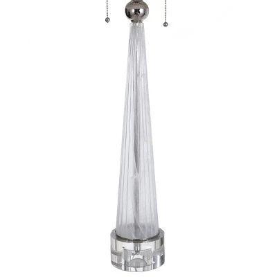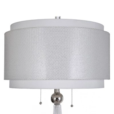 An elegant addition to a living room, the Quinn table lamp has a shade of designer white and silver fabric and a slim glass body on a crystal glass base. There’s a crystal glass finial over the two-layer shade as well as two polished nickel switch pulls that match the spherical accent at the top of the frame. Upgrade the dĂ©cor in a family room with this lovely glass table lamp. This piece exemplifies superior product design and great styling. It will pair well with any styling. Suitable for residential use in a dry location.