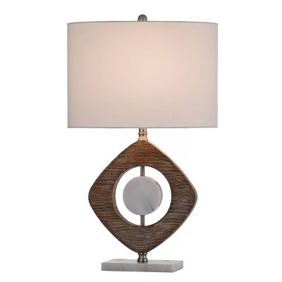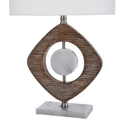 - White marble disc framed by wood-like moulded lamp body with white marble slab lamp base