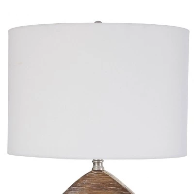 Sure to capture attention in any space, the contemporary Lucy table lamp has a white oval shade over a frame featuring white marble and molded polyresin with a wood-like finish. The white marble base matches the marble disc at the center of the frame. An attractive accent for a living room or family room, this marble table lamp is topped off with a brushed chrome finial. This piece exemplifies superior product design and great styling. It will pair well with contemporary styling. Suitable for residential use in a dry location.