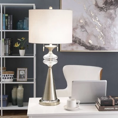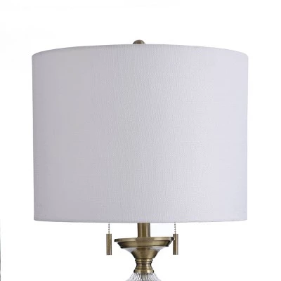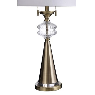 Featuring a polished brass frame with clear accents and a white drum shade, the Mava table lamp is a striking contemporary fixture. The sparkling glass and acrylic accents and the polished brass finial are decorative embellishments. With its lustrous appearance and dual pull switches, this gold table lamp is perfect for a family room or living room. This piece exemplifies superior product design and great styling. It will pair well with contemporary styling. Suitable for residential use in a dry location.
