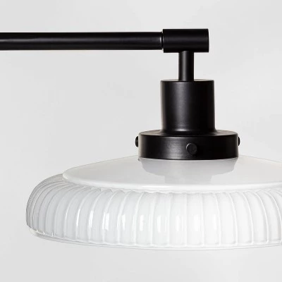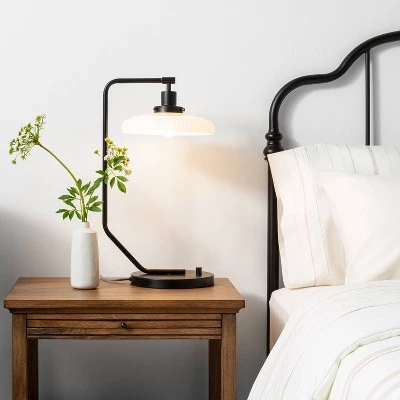 Keep your study desk well-lit in style with this Table Lamp from Hearth & Handâ„¢ with Magnolia. This sleek, modern table lamp features a ribbed downward-facing glass shade for effective and stylish illumination. Supported on a slim metal frame and a rounded base, it can be placed on any table surface for a stable display. The one-way light setting makes the lamp easy to operate, while the included LED bulb allows for long-lasting, energy-efficient illumination.