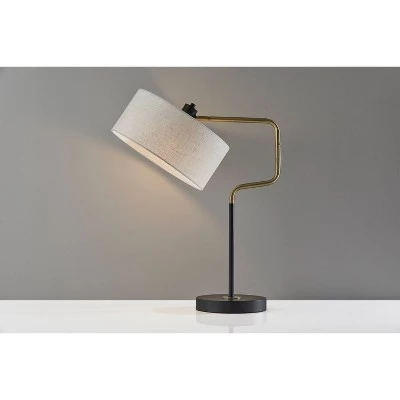 Clean lines and a modern, short drum shaped shade update the classic swing-arm style of the Jacob Table Lamp. A mix of black and brass metals add mid-century flare. The white fabric shade has soft flecks of natural colors, revealing a unique and beautiful texture when lit. Swing the arm to focus light where you desire. Bulb is not included.