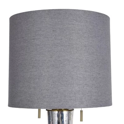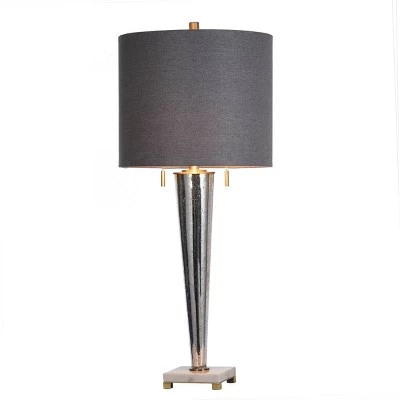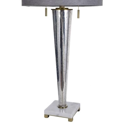 The Jasper Pillar Table Lamp from the Signature Collection by StyleCraft Home Collection anchors the tabletop dĂ©cor in an office, bedroom, or living room with its gleaming mercury glass frame, off white shade, and base of mixed materials. Two matching pull chains hang down beneath the drum shade, which enhances the mercury glass frame with hints of gray in the off white fabric. Providing another accent to the beautiful frame is the lamp’s base, which features natural marble and chrome metal.