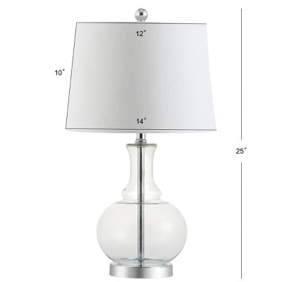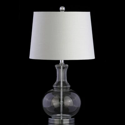 Classic curves accentuate hand-blown glass in this perfect combination of classic and contemporary. In an eye-catching glass and metallic base, rod, and finial, no design detail was overlooked. Softened with a white linen drum shade and finished with a silk-wrapped cord, the style extends all the way to the plug.