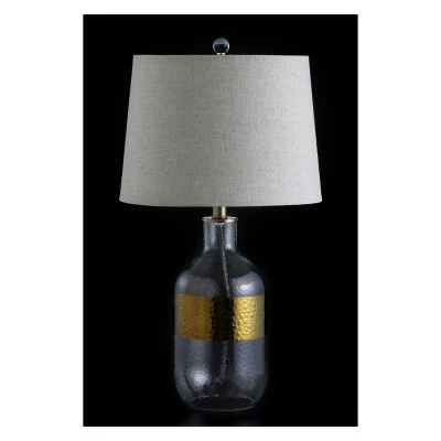 A thick brass band along the circumference of this table lamp’s glass base gives this sleek style a modern allure. Topped with an acrylic finial and a gray drum shade. With brass components and certified UL listing, its design is not only beautiful, but also built to last.
