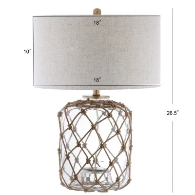 This delightful clear glass table lamp has the coastal charm of a found glass buoy. An alluring mesh of warm rope over the glass vessel creates a distinctive look in this transitional style. A warm natural fabric drum shade in a gray tint with self trim on the top and bottom completes the look.