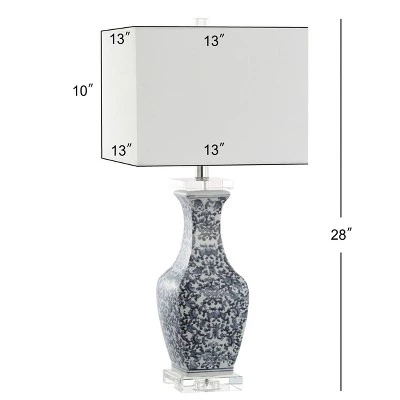 The intricate blue and white designs hand painted on the surface of this vase-shaped lamp base bring an element of chinoiserie chic to any home. In a more contemporary silhouette than the traditional ginger jar, the angles of the base are mirrored in the rectangular shade and crystal pedestal. AT 28″ high, this piece would make a lovely accent on a nightstand or in a living space.