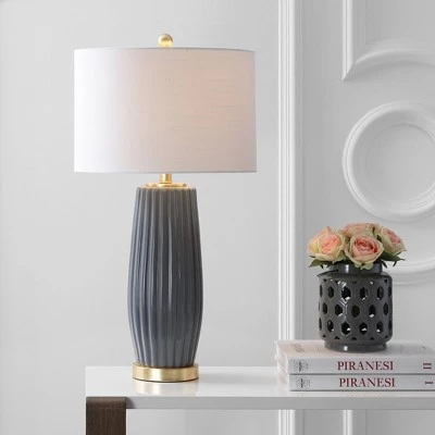 Add the finishing touch to any room in your home with this lovely fluted ceramic table lamp. Atop a brushed brass base, a solid coating of gray glaze gives this ribbed shape a high-gloss finish. Topped with a linen hardback drum shade and paired with brass fittings, the style extends all the way to the plus with a silk-wrapped cord.