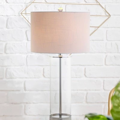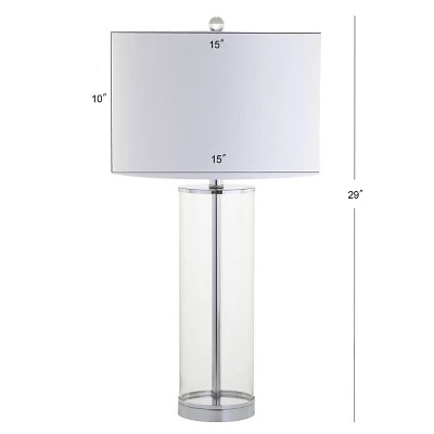 The classic clear bottle shape of this simple modern table lamp calls to mind a floating message in a bottle. Finished at the base with a chrome rim to protect your surfaces, the combination of simple glass and gleaming metal creates a decorative effect well suited to a variety of spaces. At 29″ tall, this classically proportioned table lamp would be lovely in a bedroom or living space in need of additional light.