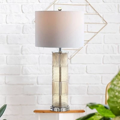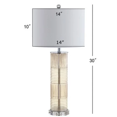 This champagne colored glass column lamp is a great accent in traditional spaces for its elegant stature and subdued color. The wavy texture of the glass, in alternating horizontal and vertical bands, adds visual interest while the translucency keeps the overall height from being overwhelming. With chrome accents, a silk-wrapped cord, and faux silk drum shade, this piece is an instant classic.