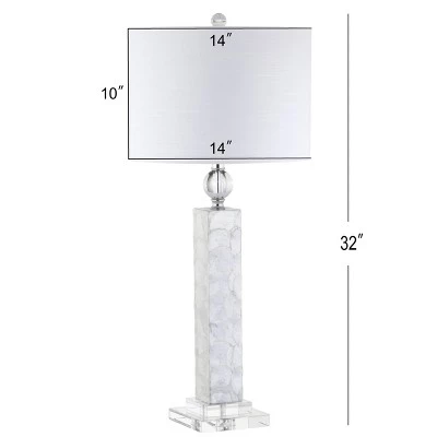 The shimmering ivory toned hues in this column table lamp add warmth to the overall look. In a mother of pearl finish with a clear crystal square base, sphere object, and finial the total piece exudes sophistication and elegance. Topped with a white linen fabric drum shade.