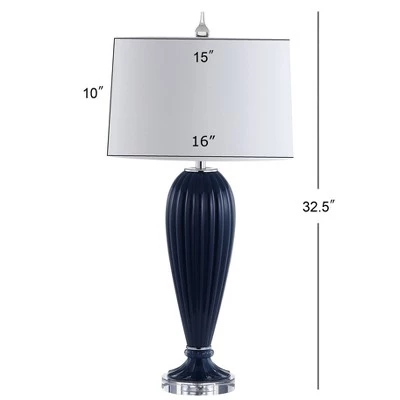 This classic ceramic table lamp shows off a penchant for sophistication plus a hint of edgy style. Take in the tasteful ribbed glass construction with a round crystal base, and a chrome finial, harp, and socket that add balance. At 32.5″ tall, it makes a statement with size while remaining understated in color — a classic navy.