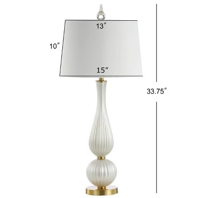 The classic double gourd lamp gets an elegant update with the addition of narrow fluting on this beautiful base. Beautifully made from glass, the iridescent white finish will brighten your favorite hideaway. A classic, white cotton drum shade adds an elegant finishing touch, especially once topped with a decorative crystal finial.
