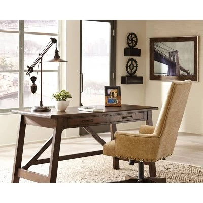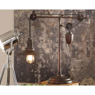 Pull off an urban industrial look with newfound flair with this table lamp. Fully functional “pulley system” is delightfully different. For the ultimate vintage touch, opt for Edison-style light bulbs. Oil rubbed bronze finished metal desk lamp. Metal shade. Adjustable arm and shade. On/off in-line switch. (1) E26 socket, type A bulb recommended – 60 watts max or 13 watts max CFL. Signature Design by Ashley is a registered trademark of Ashley Furniture Industries, Inc.