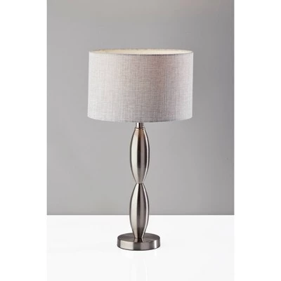 The classic candlestick shape is given a contemporary spin in the design of the Lance table lamp. The 25″ tall lamp features a brushed steel finish on the stem and matching round base, which is perfectly complemented by the light gray and white textured shade for a distinctive, contemporary look. The short drum shade is 8″ high and 13″ in diameter and softly distills light from a 100W bulb (not included). Operated by a rotary socket switch to easily turn it on or off, the Lance table lamp also includes a 5′ clear cord. This lamp is also available in a black metal finish for a darker look.