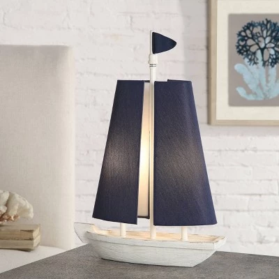The contemporary Maritime table lamp showcases nautical flair with its sailboat-shaped white frame and two navy blue linen shades that look like sails. A charming accent to coastal décor in a family room or living room, this lamp is crafted in a process that ensures it is unique. The small flag-shaped finial matches the navy blue color of the U-shaped sail shades, creating the finishing touch on this sailboat table lamp.