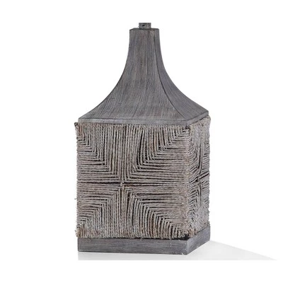 - Whitewashed poly resin wood-grained design with a natural rattan woven design within the middle of lamp base