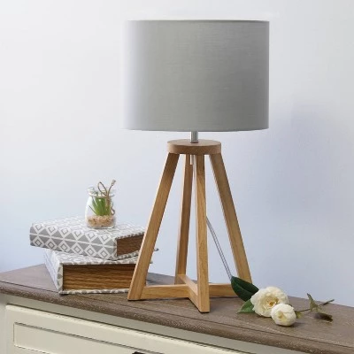 Add a touch of simplicity to your home with this contemporary lamp. It has a soft, gray fabric shade that compliments the geometric natural wood base and clear cord for a clean, simple look. This is the perfect lamp for a bedroom, living area, office, kid’s room or college dorm.