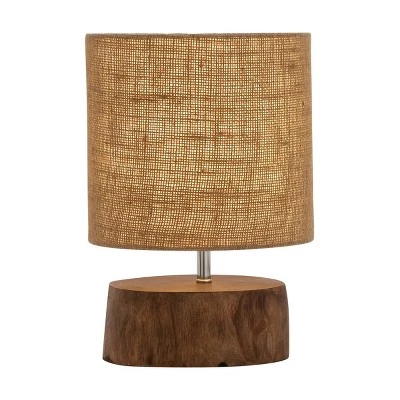 Let Mother Nature guide your interior decorating plans, starting with your lighting. This features a mahogany slab base that fits in perfectly with a natural themed bedroom, living room, or study. A beige jute shade sits above the base, offering a stylishly organic way to soften the lamp’s light. The lamp has a 10” width, which allows it to fit easily on an end table, desk, or bookcase. Designed with black rubber stoppers at the base that prevent scratching furniture and table tops, as well as sliding around. Uses one standard E26 light bulb (not included). This item has a 73” cord length. Suitable for indoor use only. A drum shaped shade made of linen. Convenient flip switch on electrical cord. Rustic theme. This item comes shipped in one carton.
