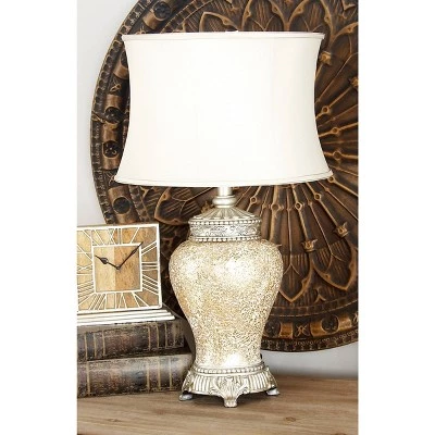 Brighten up any room to create a warming atmosphere for you and your guests with this chic table lamp. Make a statement with this unique lamp on mantle, console table or in any living space. Surprise your guests with this stunning table lamp that serves both decorative and functional purposes. Ideal to place on any Tuscan-inspired accent table in your lobby, living room, library, kitchen, or bedroom. Requires 1 Standard Type A bulb, not included. Cord length is 62 inches. Suitable for indoor use only. Item features a wide bell-shaped shade that measures 18”L x 11.50”H.Comes with a push button switch. Glam style. This item ships in one carton.