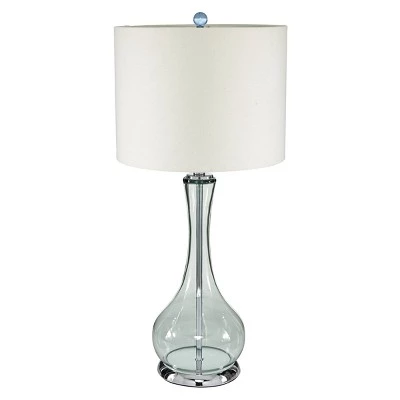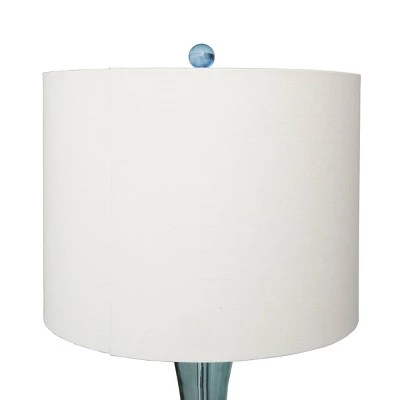 Befitting of both contemporary and traditional style, this light aqua blue glass bottle lamp features a transparent body with a subtle ocean blue hue. It’s metallic silver base and stem are neutral, along with the white drum lamp shade. The clear electrical cord keeps with the light airy feel this accent lighting brings. Designed with black rubber stoppers at the base that prevent scratching furniture and table tops, as well as sliding around. Used one standard 40-100 watt bulb (not included). This traditional table lamp has a 75″ cord. Suitable for indoor use only. This glass table lamp comes with a rectangular linen shade. Clear electrical cord and on/off switch under shade. This item comes shipped in one carton. Traditional style.