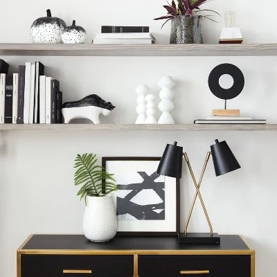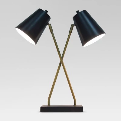 Add some extra light to your living space with the Olson Two-Head Task Lamp from Project 62™. This modern task lamp features a sleek metal design in neutral colors that looks stunning in any decor setting. Each head has its own on/off switch so you always get as much light as you need, while the adjustable heads let you direct the beam in just the right spot. Whether you use it while studying at your desk or while reading before bed, this metal desk lamp is perfect for any task that arises. This lamp is available for purchase with or without bulbs.
