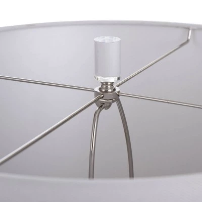 The Epping table lamp is a contemporary accent light with a white drum shade over a gray ceramic column body on a clear acrylic base. A bold fixture for a living room or family room, this gray lamp’s ceramic frame features a striking openwork design. The clear finial atop the simple white drum shade matches the acrylic base. This piece exemplifies superior product design and great styling. It will pair well with contemporary styling. Suitable for residential use in a dry location.