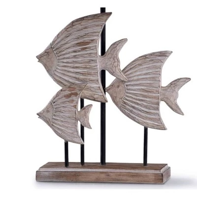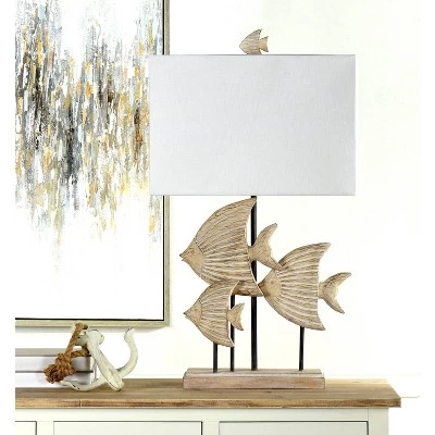 Accent your home décor with this Carved Fishes table lamp from the Signature Collection by StyleCraft Home Collection. Coastal style comes in spades with this transitional table lamp. A polyresin frame features intricately carved fish covered in a weathered beige and wood finish. The detailed body is accented by a steel base and a white shade made from a blend of polyester and rayon. A charming and stylish table lamp made for offices, bedrooms and foyers. It will pair well with coastal and nautical styling. Regardless if you put it in the bedroom or family room, this table lamp stands out. Suitable for residential use in a dry location. This modern table lamp is UL listed in compliance with the nationally recognized safety standards.