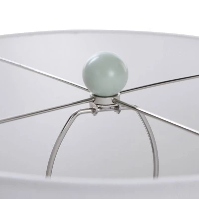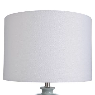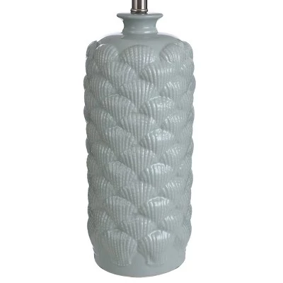 Featuring a white shade, the Bedok table lamp is a contemporary accent with aquatic flair: a light blue ceramic frame with a textured seashell design and a brushed steel neck. The light blue finial matches the color of the frame. Add an ocean-inspired touch to a living room or family room with this blue and white table lamp. This piece exemplifies superior product design and great styling. It will pair well with contemporary styling. Suitable for residential use in a dry location.